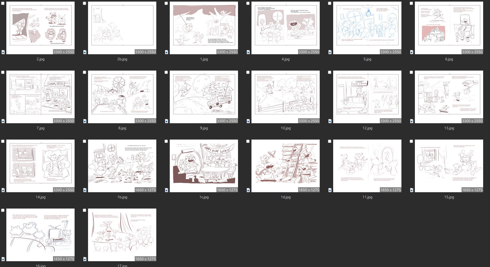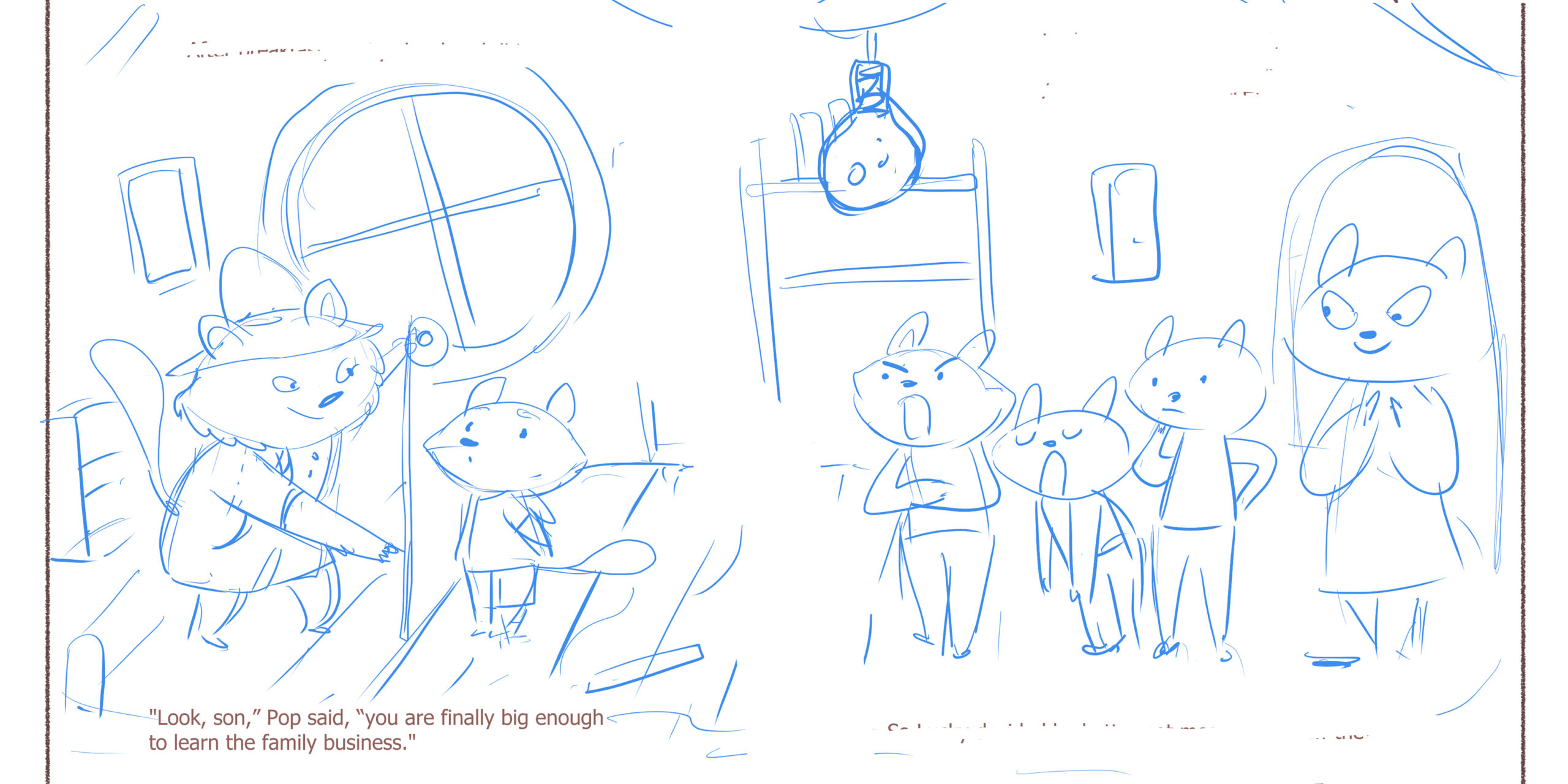 In this scene, you can see how the image dimension changes from thumbnail/spread to a single page full-bleed image. I personally like the raccoons riding the pull cart but it didn’t survive the cut. What do you think?