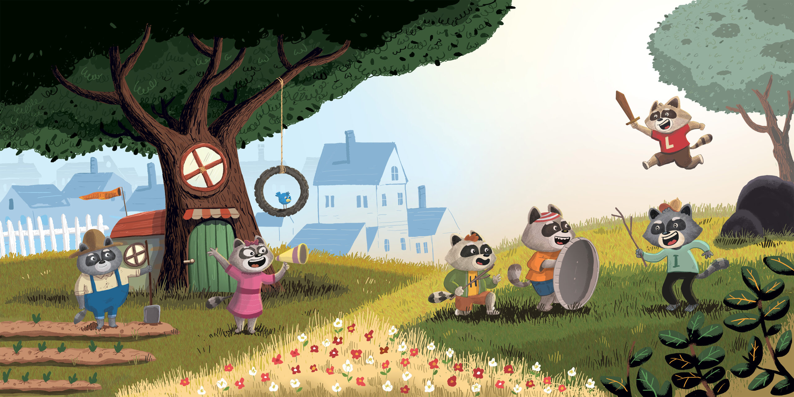 This is the very first scene in the book. We recognize Lucky right away and his place in this family. It also establishes the world, the raccoon’s house, and its place in the community. The early sketches were not to the correct dimension of the book (still to be determined at this stage of the process).