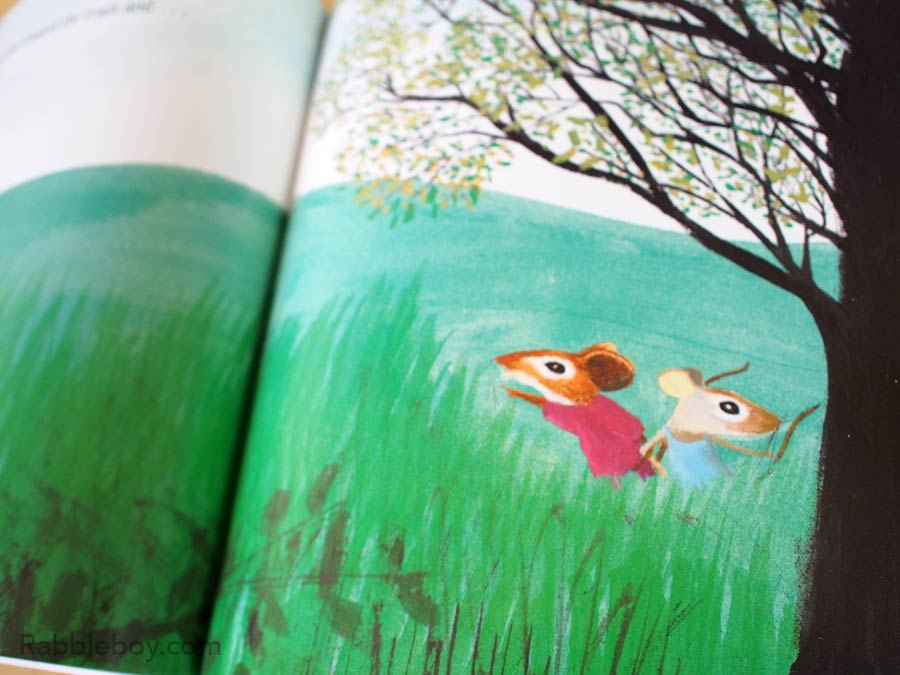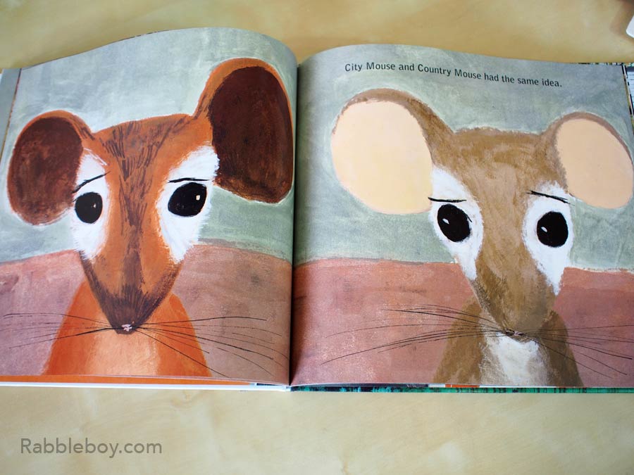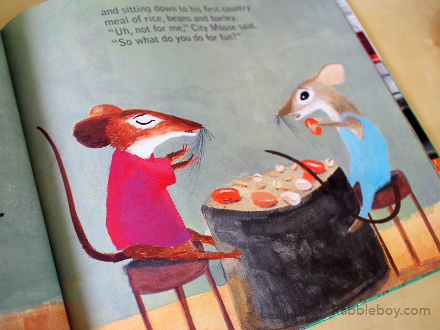 (Pages 4-5) City Mouse travelled to the country and was greeted by Country Mouse. But he was quickly bored and wanted to have fun.
