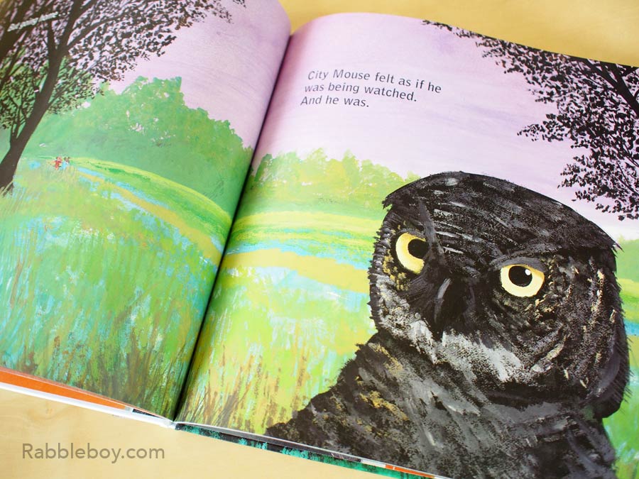 (Pages 28-29) Quicker than a page turn, Country Mice returns to the country and he was happy.