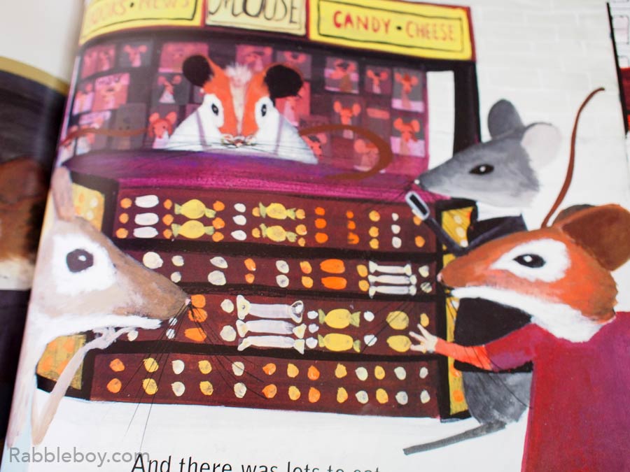 (Pages 20-25) The friends arrived in the city and everything was different, from the tall buildings to the dancing mice by the train station. There were lots to eat and there were busy mice going about their business.
