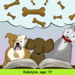 Day’s design features three dogs reading a book, with a thought bubble full of toy bones. She created the image in Adobe Illustrator and finished coloring it in Photoshop.