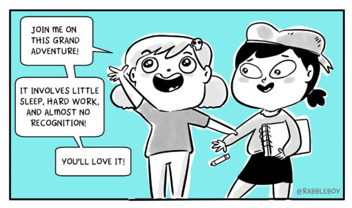 You don’t have to go traditional publishing if you don’t want to. Comics have always had a rebellious streak from grassroots publishing and fandom. Comic creators and fans were outsiders for the longest time, and they support each other. There are many ways to publish either via small press, crowdfunding or print-on-demand.