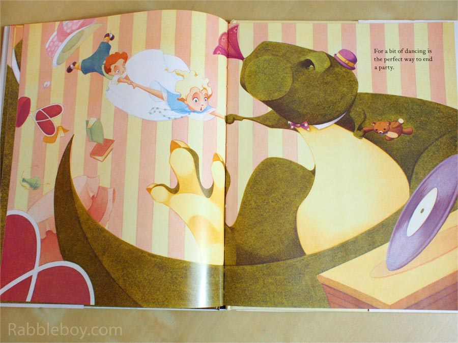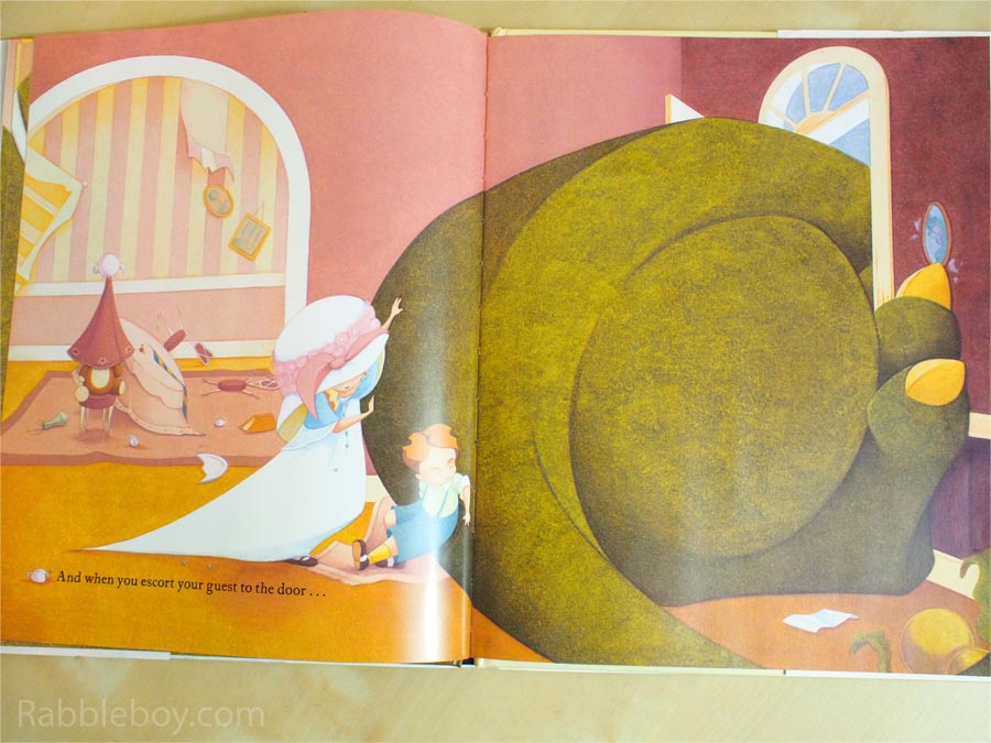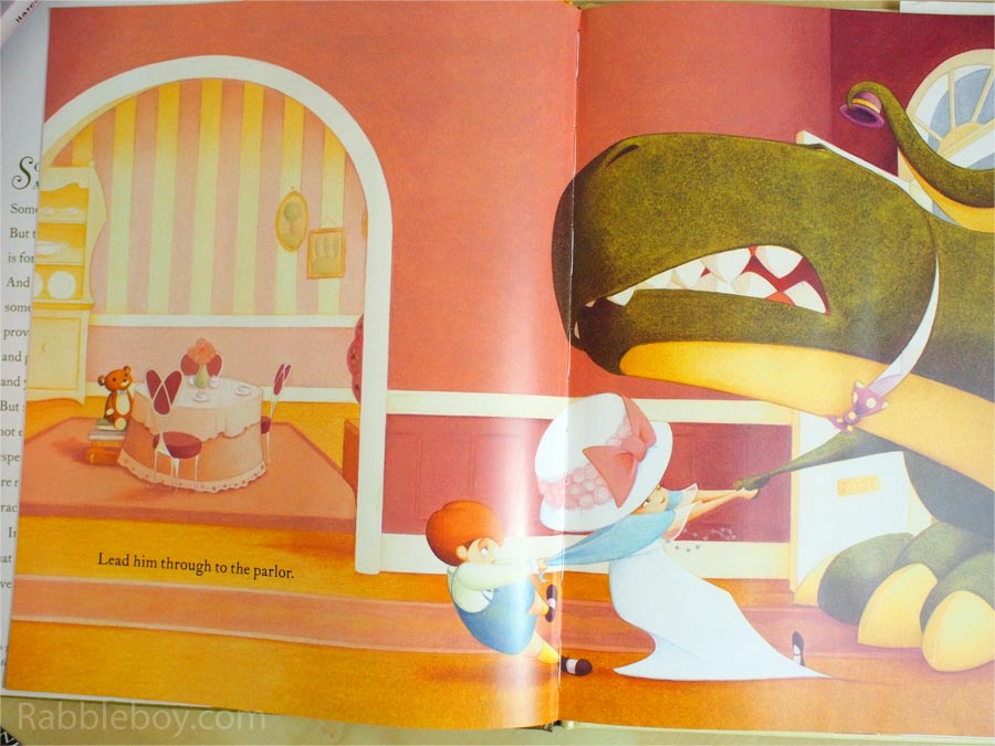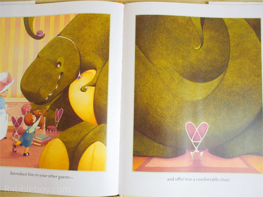 Some kids like tea parties, others like dinosaurs, and never the twain shall meet—until now? Idle cleverly constructs her picture book as a Miss Manners–style primer on how to throw a delightfully proper tea party, and the prose’s stiff upper lip never falters no matter the monster-sized faux pas occurring within the illustrations. After greeting a guest at the door, “Lead him through to the parlor.” (Illustration: siblings straining to pull a giant green dinosaur through a human-sized door.) Next: “Offer him a comfortable chair.” (Illustration: a dainty pink chair nearly crushed beneath a behemoth rear end.) And on it goes with the dino wreaking havoc upon each highly civilized instance of small talk or cake serving. The cuddly yet giddily preposterous pencil art has the still-life absurdity of Chris Van Allsburg, with characters always frozen in the throes of some larger-than-life struggle against their well-meaning but deadpan dinosaur friend. A fine example of how words and pictures can lock horns to charming effect. Grades K-2. –Daniel Kraus